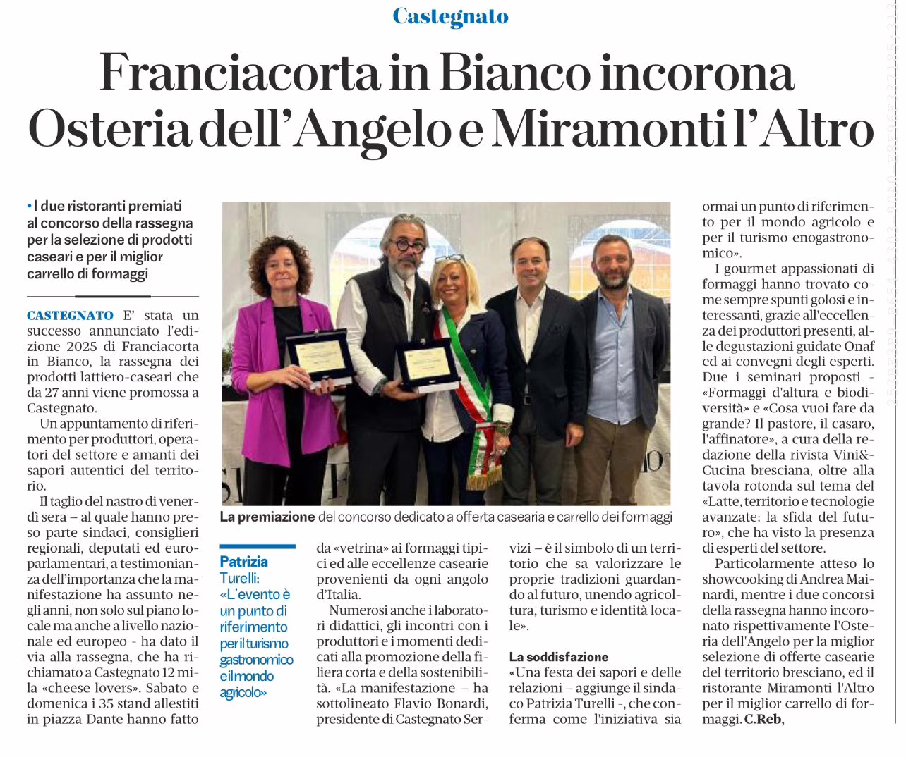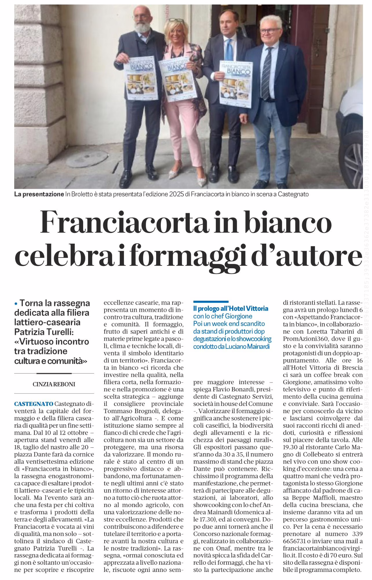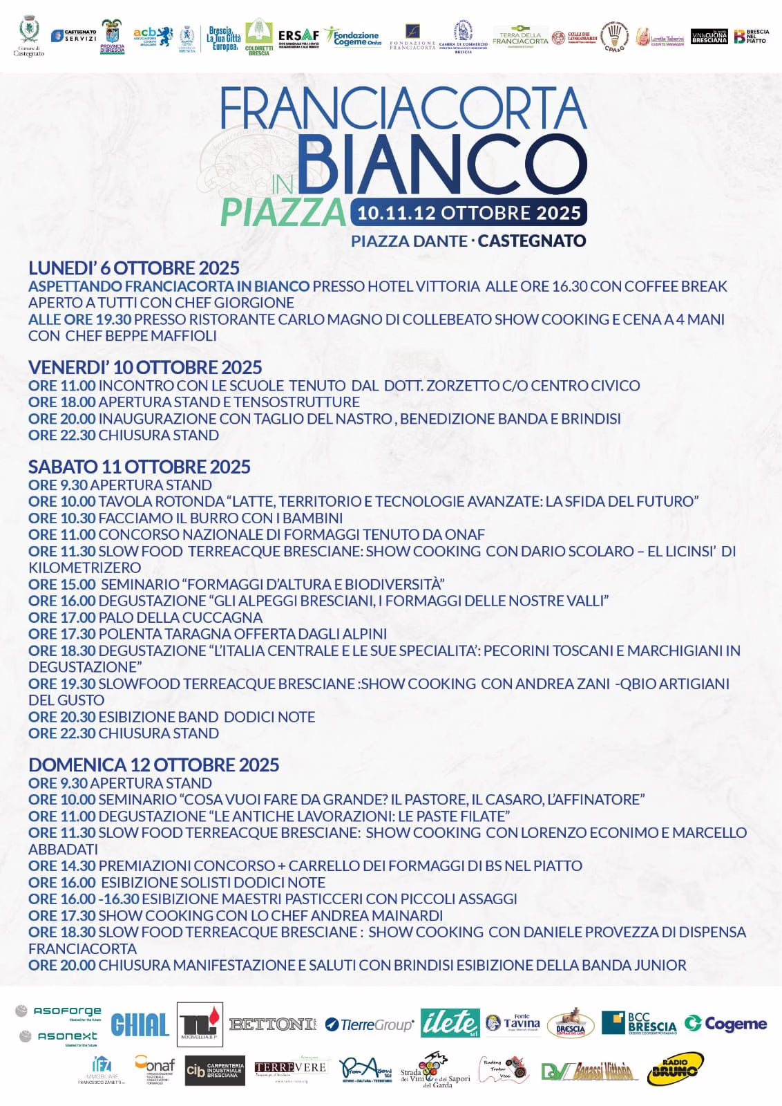 Sono numerose le novità dell’edizione 2025 di Franciacorta in bianco, la kermesse dedicata ai formaggi che si terrà a Castegnato da venerdì 10 a domenica 12 ottobre, con un assaggio particolarmente gustoso lunedì 6 ottobre, al ristorante Carlo Magno di Brescia.